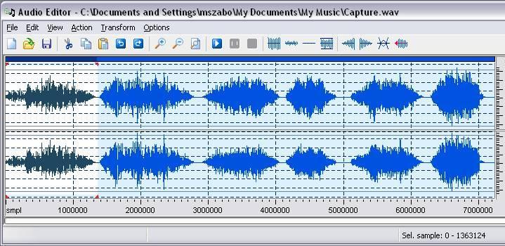 • 3. Notice the 'flat' areas within the waveform (blue blobs). They represent 'silence'. This 'silence' will be the space between the songs on the LP